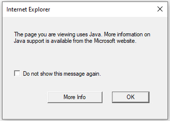 Assuming you are using Edge in IE mode, after clicking on OK from one of our applet pages, your browser will show you a popup saying that you need to support Java, figure 1 and the web page will look like figure 2: you need to install a 32 bits Java virtual machine.