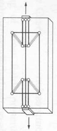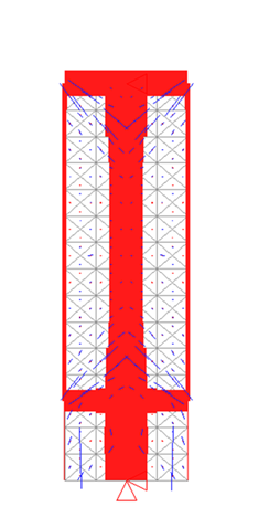 Let us now study the behavior of a concrete element subjected to the local introduction of tensile forces. The figure below shows the corresponding strut-and-tie model, which is more complex than that for compression and requires the presence of longitudinal reinforcement (to resist the tensile force) and transverse reinforcement (to distribute the force across the width of the element).