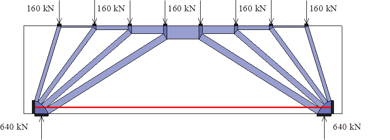 Let us now consider the previous reinforced concrete beam by dividing the load into four equivalent loads that have the same resultant. The dimensions of the horizontal compressed strut at the centre of the beam, as well as the forces in the reinforcement, therefore remain identical to the previous solution.