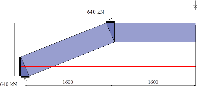 The structural behaviour changes compared to the previous cases: the distance between the load and the support is now considerable, and the strut is too inclined for direct support, as the behaviour of compressed struts with a resultant direction close to that of the tension member is problematic. Indeed, if the beam has only flexural reinforcement, without stirrups, a flexural crack can propagate in the compressed zone and cause a brittle failure of the beam due to shear forces.